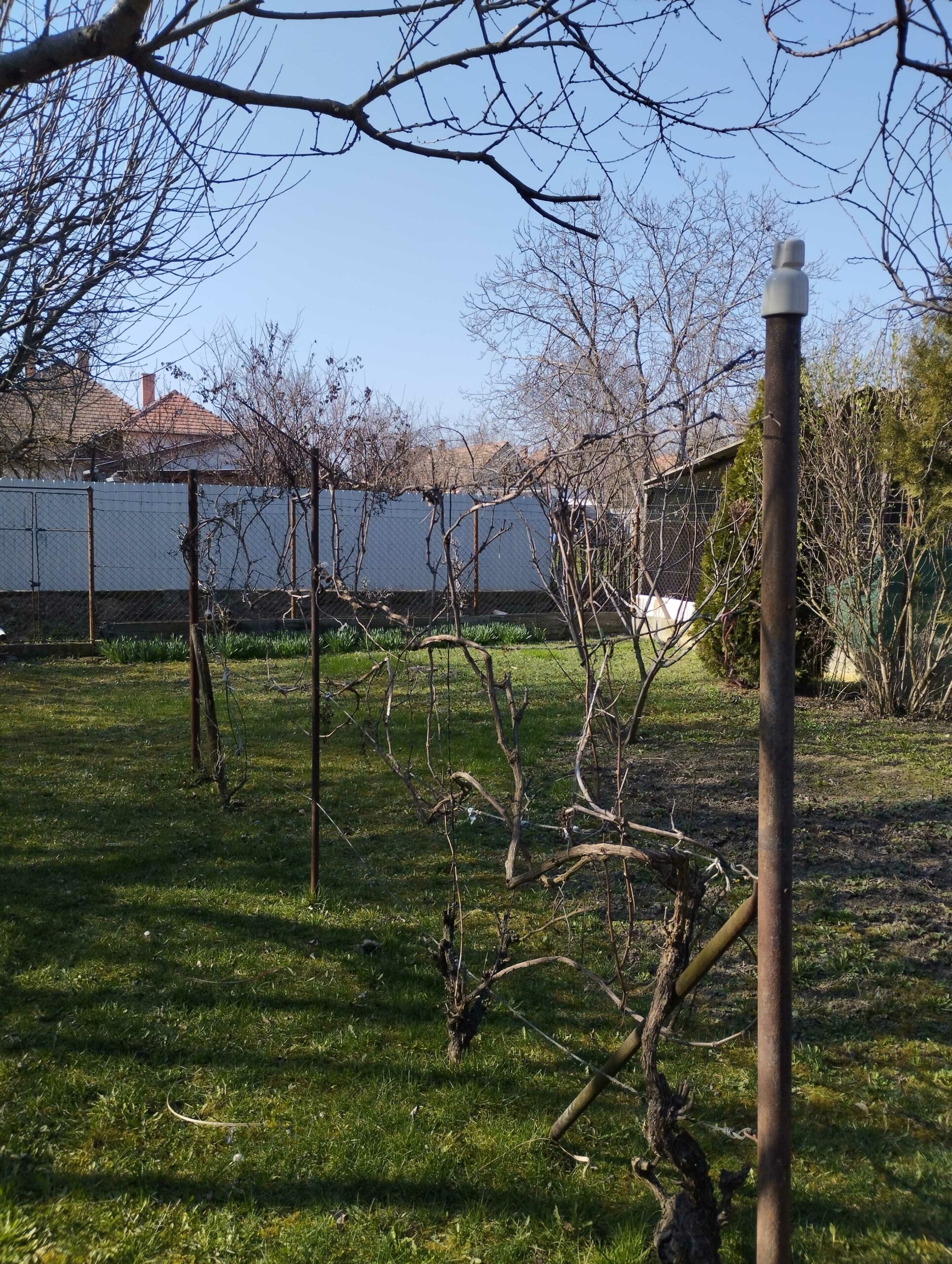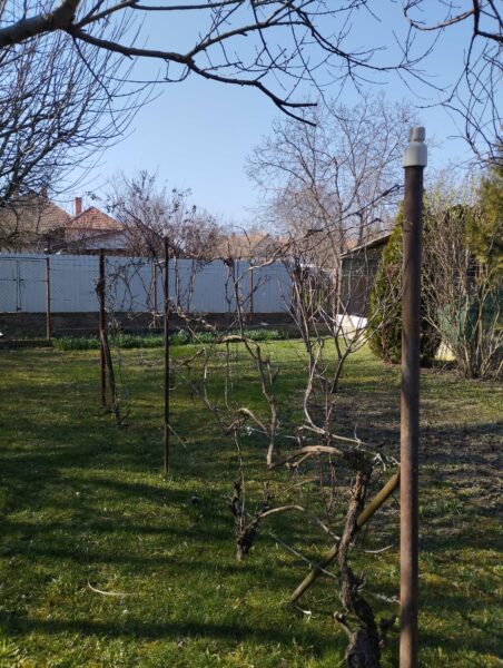 Két barackfa és szőlő is megtalálható rajta, így ideális hely pihenésre vagy akár kerti tevékenységekre.