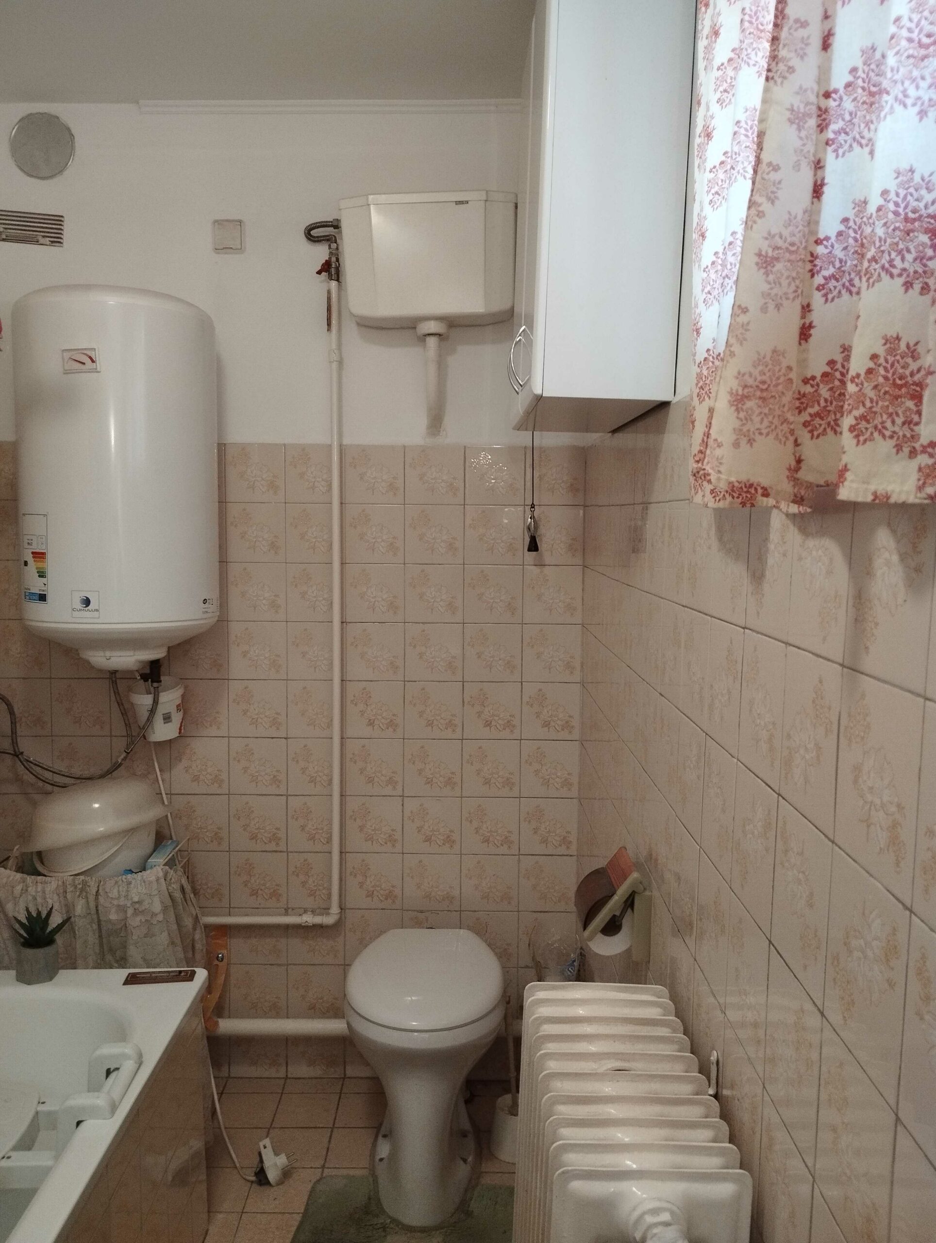 A fürdőszoba és a WC egy helyiségben került kialakításra, kádas megoldással, a meleg vizet villanybojler biztosítja.