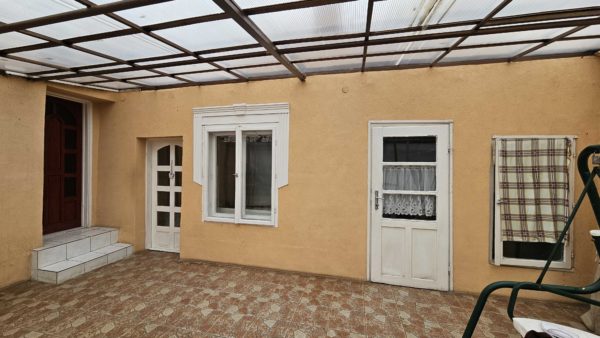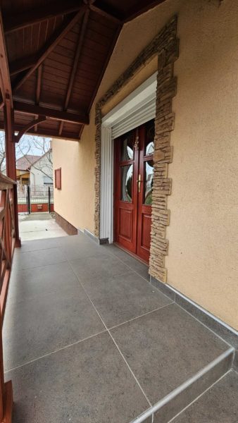 A hátsó ajtón át egy polikarbonáttal fedett, könnyűszerkezetes teraszon keresztül juthatunk a konyhába és a kazánházba.